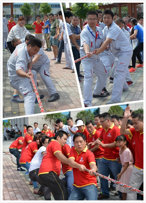 拔河比賽首場(chǎng)比賽由嵩陽煤機(jī)刮板機(jī)隊(duì)和TATA木門木工隊(duì)進(jìn)行,隨著裁判“開始”口令聲落,競(jìng)技雙方隊(duì)員同時(shí)發(fā)力,緊握手中的繩子,勒繩下腰,降低重心,齊心協(xié)力往后拉。熱情的煤機(jī)啦啦隊(duì)不顧天氣的炎熱,為自己的隊(duì)伍助威吶喊。